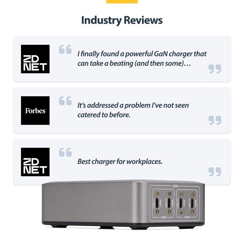 Simplify workspace charging with this 240W USB-C GaN Desk Charger for modern work environments. Charge up to four devices simultaneously with Power Delivery 3.1 and 240W total power (single port 140W EPR), making it ideal for boardrooms and desks.