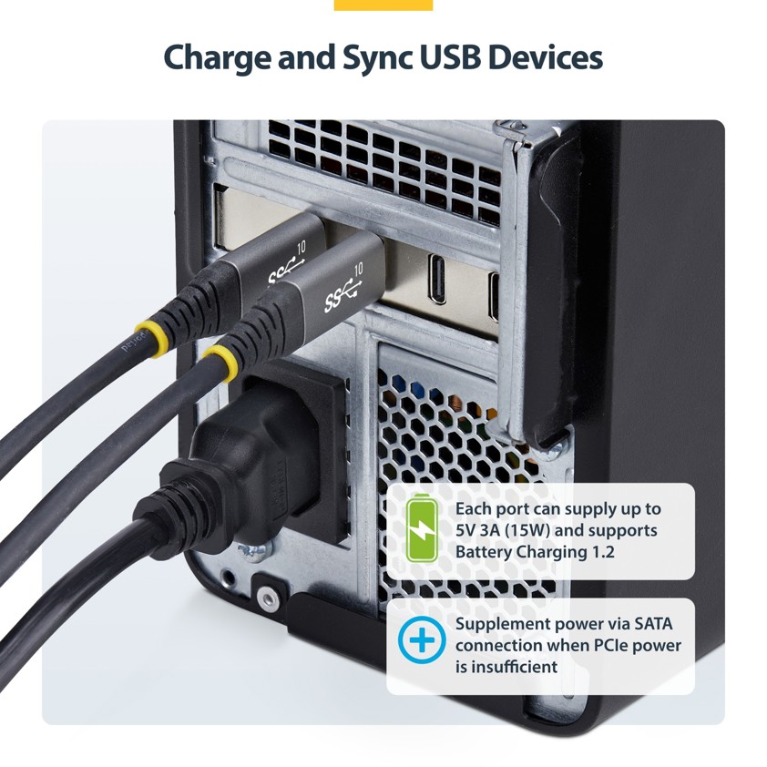 This USB PCI Express card can provide up to 5V 3A (15W) per USB-C port, enabling sync and charge of portable devices. If the motherboard can't supply enough power, a built-in SATA power connector can supply additional power to the card.