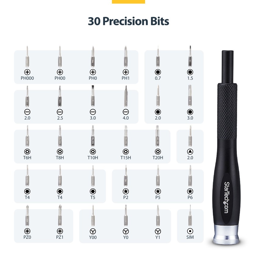 The set includes 30 S2 steel magnetic bits, Phillips, Torx, Pentalobe, Hex, Slotted, Tri-wing, Triangle, Spanner, and SIM ejector styles. These bits offer quick access and compatibility across a broad range of devices, from Ultrabooks to smartphones.