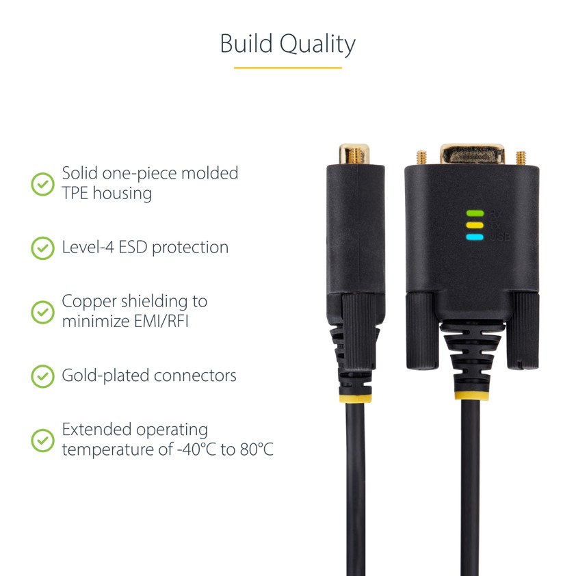 The rugged TPE construction and Level-4 ESD protection (15kV air and 8kV contact) enhance the reliability and longevity of the USB to Serial Adapter. Copper shielding minimizes Electromagnetic and Radio Frequency Interference (EMI and RFI). Gold-plated connectors enhance signal conductivity.
