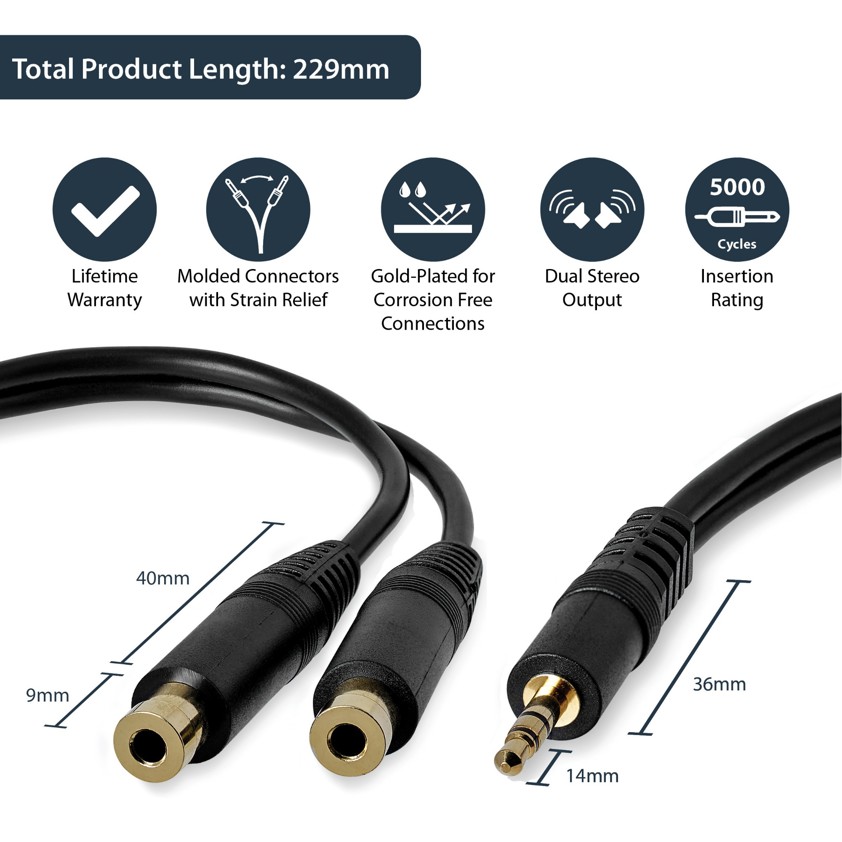 A practical, cost-effective audio solution, the 3.5mm stereo splitter cable features fully molded connectors with strain relief for long-lasting durability and high quality gold terminals to ensure corrosion-free connections.The 3.5mm audio splitter/Y-cable is backed by StarTech.com's Lifetime warranty.