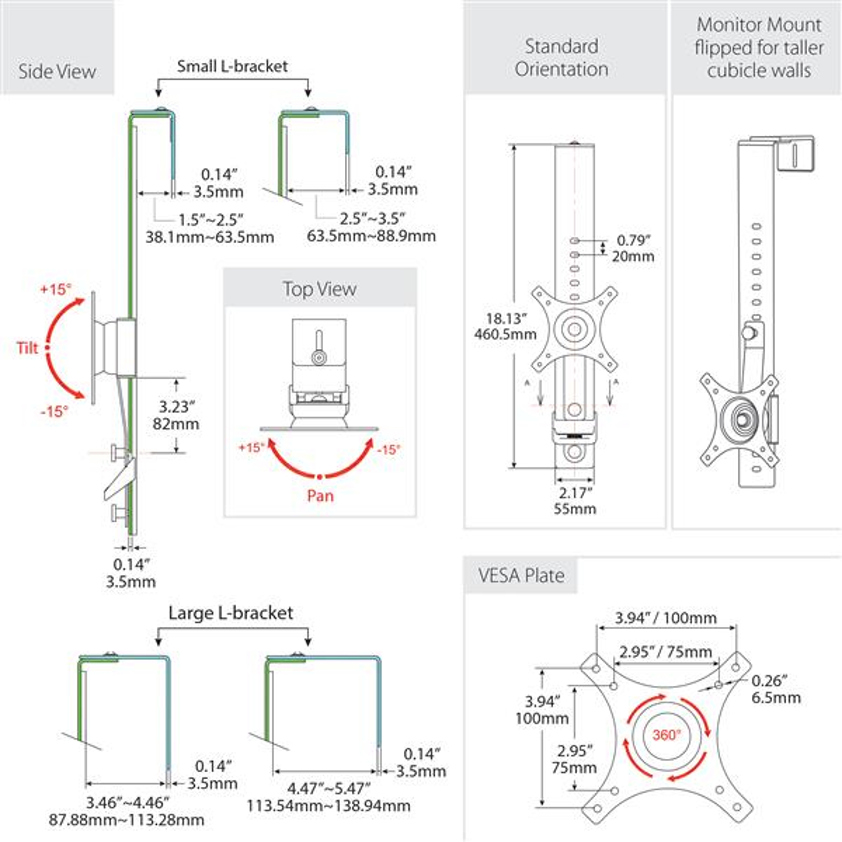 The monitor mount provides fast and easy installations. Simply select the width, attach the monitor, hang it over the cubicle wall, adjust the height and route the cables.