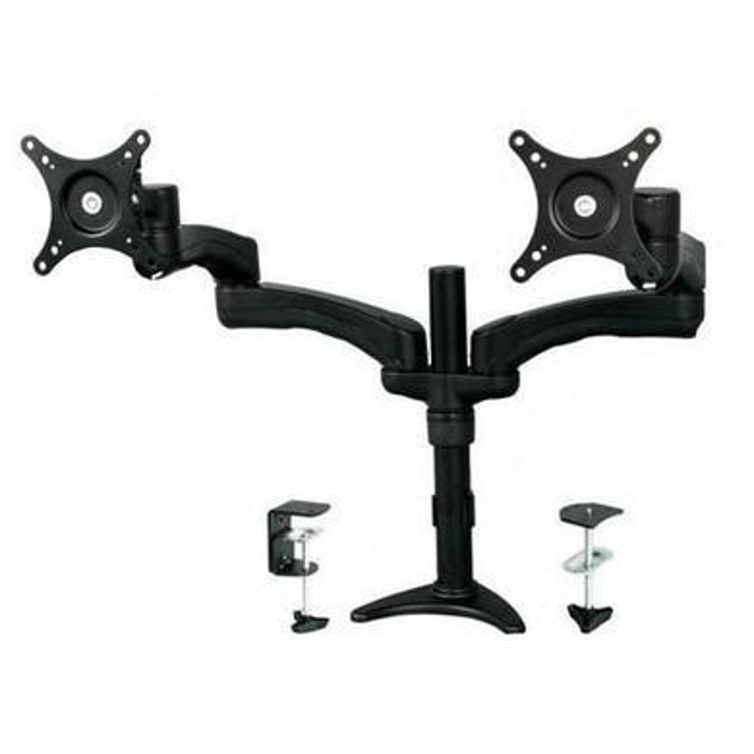 Enhance productivity while freeing up space. This desk mount dual monitor arm lets you mount two VESA (75x75, 100x100) displays to your desk or table, with extension, tilt, pan, swivel, pivot and height adjustments.