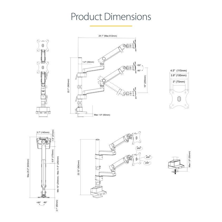 Set up an ergonomic work environment and reclaim valuable workspace on your desk. The adjustable monitor mount lets you extend the arm out a full 23.4" (59.4cm) from the pole and a max height of 30" (76.2cm) with the displays side by side. The full-motion arm moves freely around the pole to provide a wide range of motion across multiple axes. You can tilt, swivel, and rotate your monitor +/-90 degrees, to adjust your display to the ideal viewing angle. Switch back and forth from landscape to portrait orientation at any time. The height of the arm can be raised or lowered easily without the need of tools by adjusting them with your hands for smooth and effortless positioning. The monitor arms have a height range of 10" and for increased height, the arms can be adjusted on the pole as well.