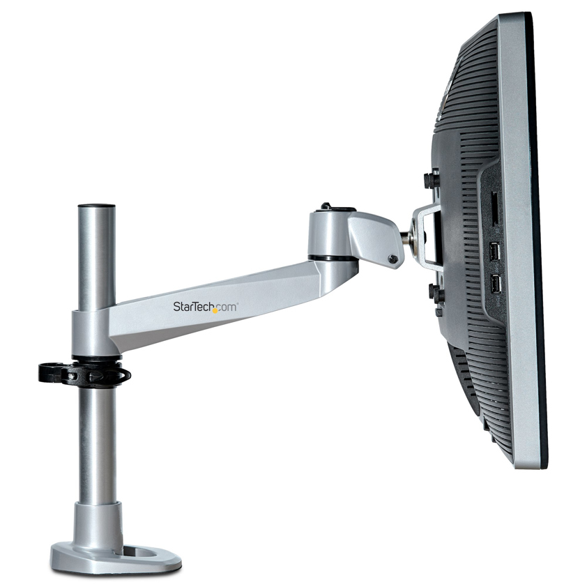 With its articulating arm, the monitor mount makes it easy to find the right viewing angle. Pan a full +180/-180 degrees left or right and tilt your display +90/-15 degrees to adjust the angle up or down. For landscape or portrait viewing, rotate your display 360 degrees.