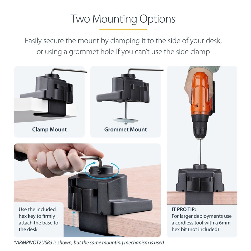 The VESA mount monitor stand is easy to install (desk C-clamp or grommet mount) and offers built-in cable management and dual USB 3.0 port passthrough for connecting your computer. The detachable VESA mount makes it simple to attach your monitor.