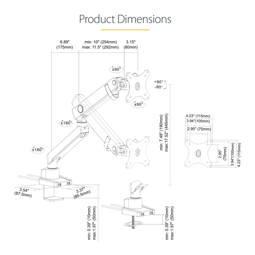 With up to 17.5" (445 mm) of height adjustment, the slim monitor-mount arm features a mechanical spring that makes it easy to raise or lower your display offering a toolless adjustable height range of 10.1". Adjust the tension according to the weight of your monitor for effortless movement.