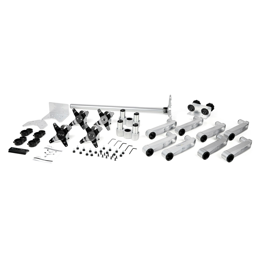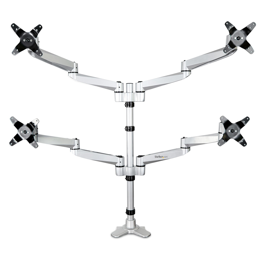 Create a highly productive ergonomic workspace with this premium quad monitor mount, supporting four monitors up to 30" each. Four articulating monitor arms feature dual-swivel action, providing a wide range of motion side to side. The attractive silver finish enhances the aesthetics of your workspace.