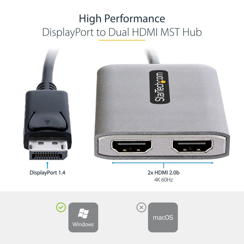 This DisplayPort to HDMI MST Hub drives two 4K 60Hz HDMI monitors from a DisplayPort enabled Windows device.