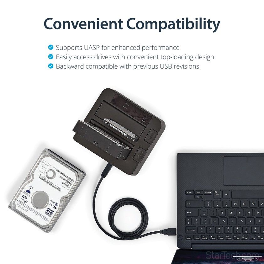 The dual-drive docking station comes with a USB Type-A to B cable, providing backward compatibility with your existing USB 3.0, 2.0 and 1.x devices. It also supports UASP for enhanced performance.