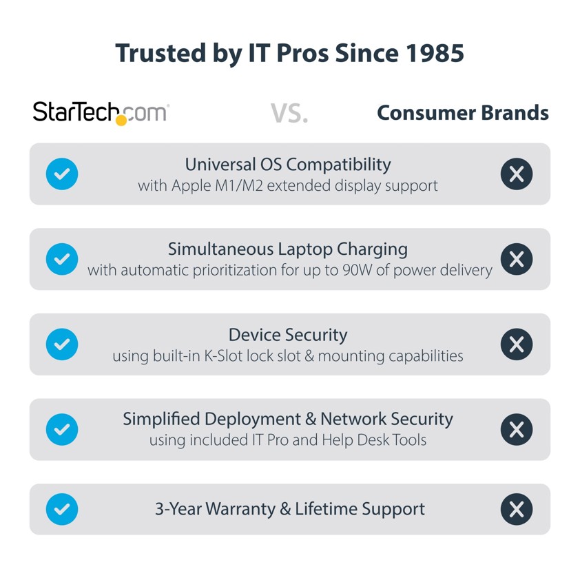 The Dock is DisplayLink Certified, for Plug and Display compatibility with Windows, ChromeOS, and macOS, enabling operation and switching between multiple computers with different operating systems. DisplayLink technology also supports extended dual displays on base Apple M-Series MacBooks, which are not natively capable of driving more than one external display. The DisplayLink Certification ensures support for resolutions up to 4K 60Hz on both external displays.