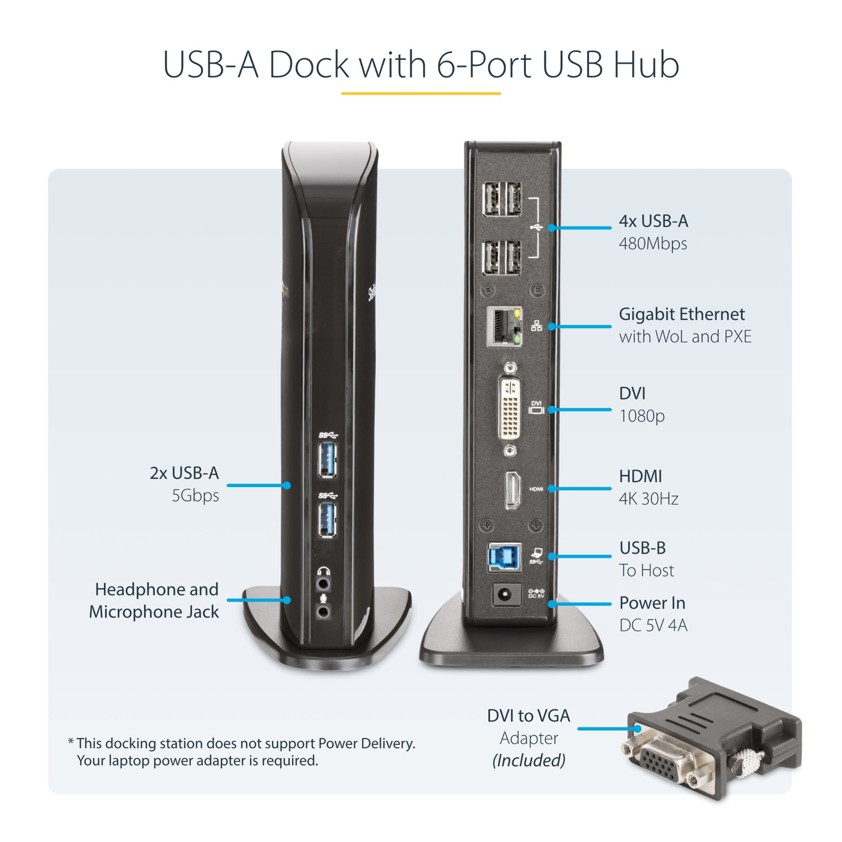 StarTech.com Dual Monitor USB 3.0 Docking Station with HDMI - DVI - 6 x USB Ports~Dual Monitor USB 3.0 Laptop Docking Station with HDMI & DVI/VGA, 6x USB-A Hub, GbE, Audio, Universal Type-A Dock - Windows/macOS/ChromeOS