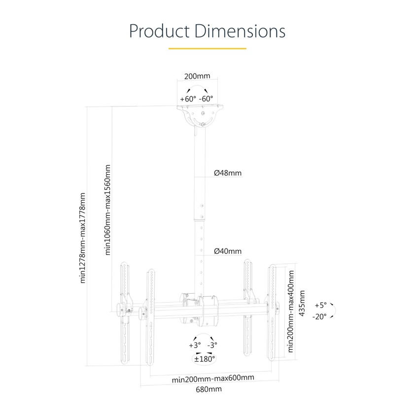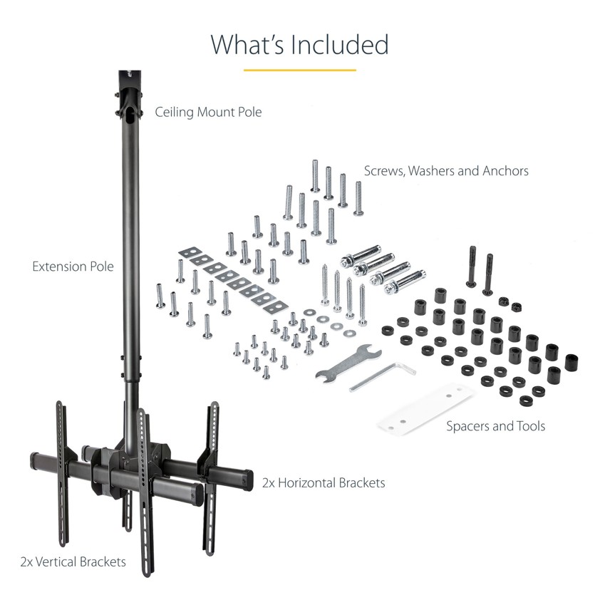 • StarTech.com Dual TV Ceiling Mount - Back-to-Back Heavy Duty Hanging Dual Screen Mount with Adjustable Telescopic Pole - Tilt/Swivel/Rotate - VESA Bracket for 32”-75" Displays