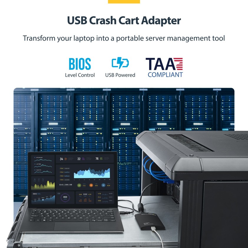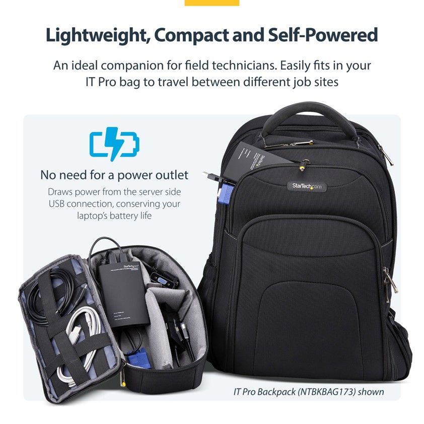 With portability for the mobile administrator or repair technician in mind, this USB-powered adapter features a small-footprint design that requires no additional accessories to connect to most servers, and requires no server-side software installation. Plus, the pocket-sized adapter draws its power from the server-side USB connections, allowing the laptop/netbook to last longer without consuming battery power.