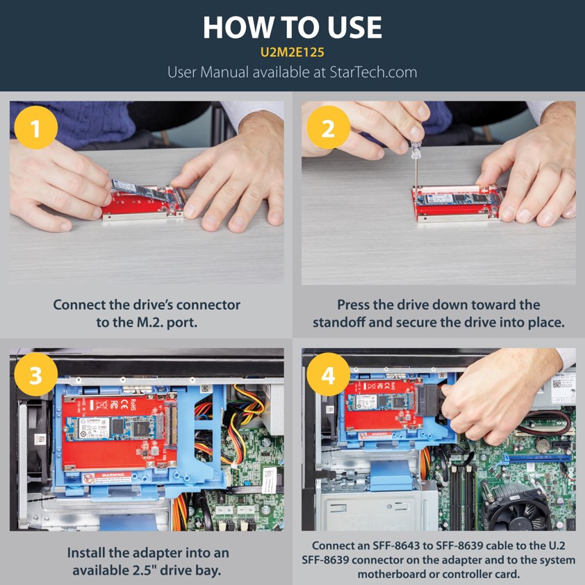 Add the fast performance of an M.2 NVMe SSD to your desktop computer or server by converting the drive through a U.2 (SFF-8639) compatible interface on your motherboard