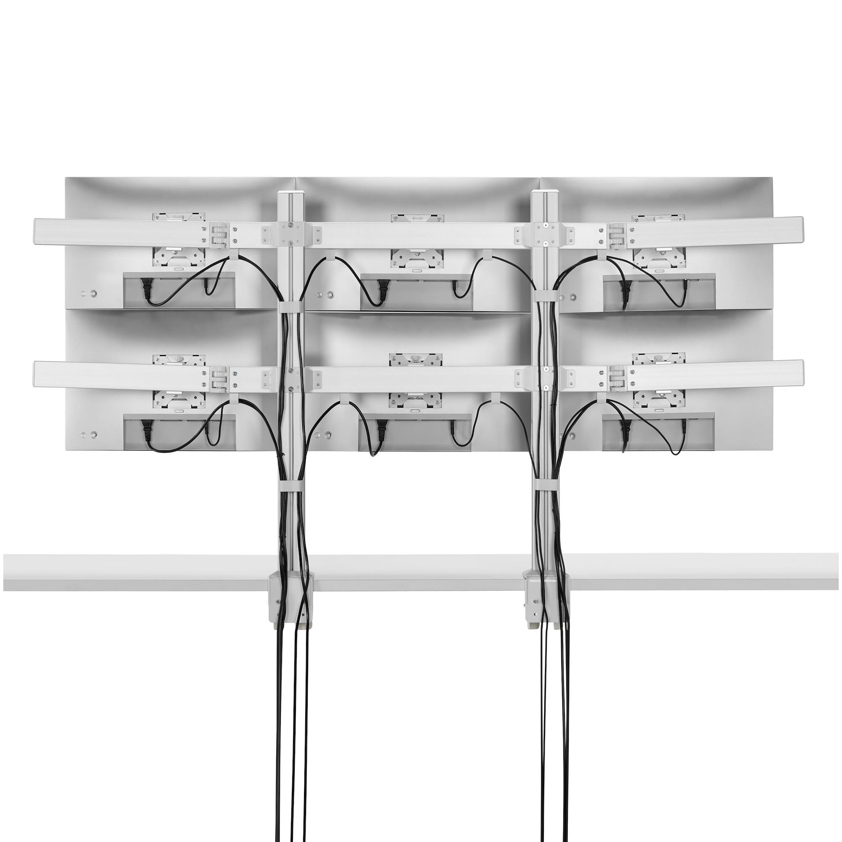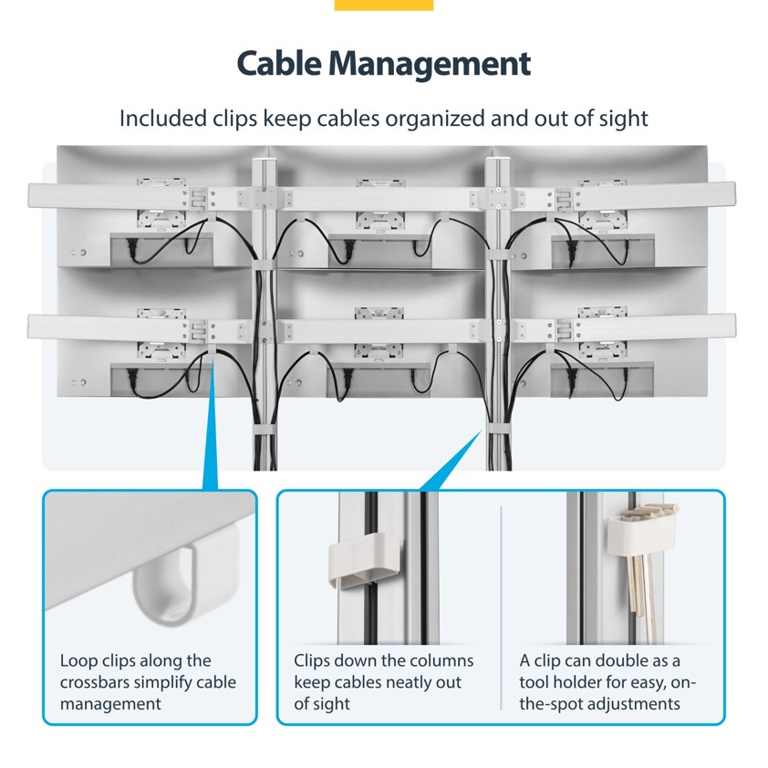 To maintain an organized workspace, the mount includes cable clips for the crossbars and columns to keep cables neatly tucked away and out of sight. Combine accessories such as cable ties and hooks (parts HKLP25GN and CBMZT8B) for a tidier setup.
