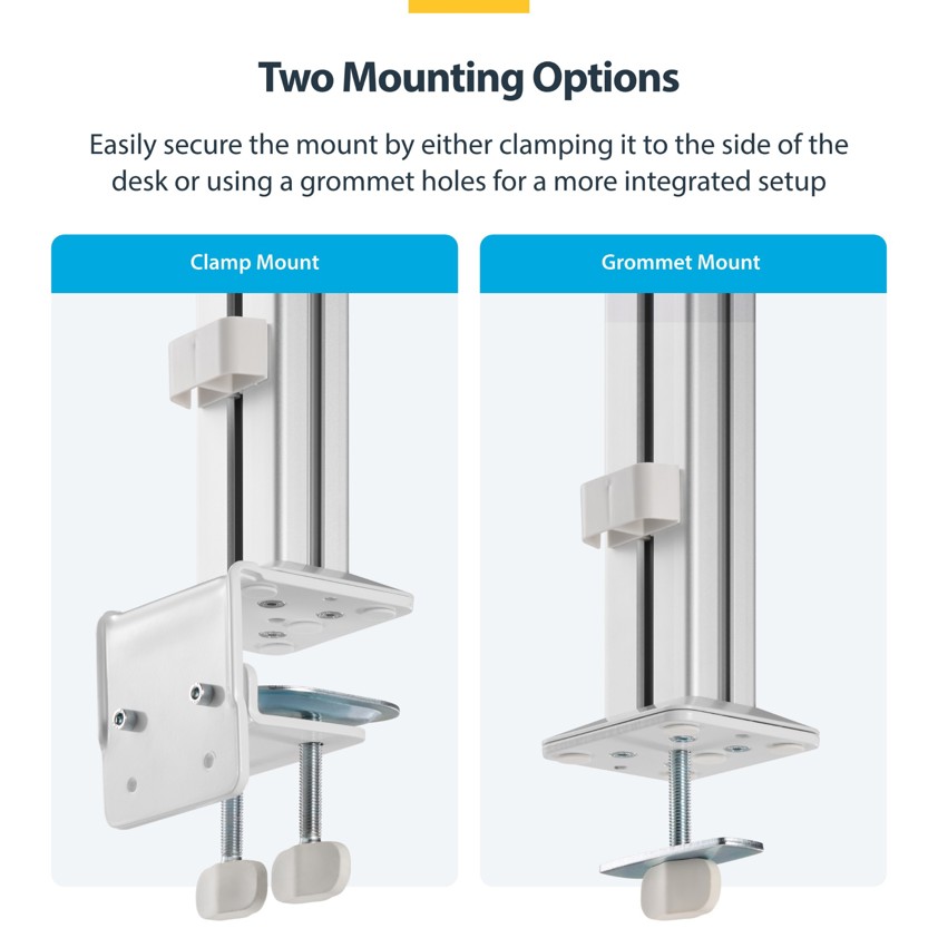 The mount offers dual mounting options: robust C-clamps for desks from 0.4 to 2.9in (1 to 7.5cm) thick or grommet hole mounts for desks from 0.4 to 1.7in (1 to 4.5cm) thick.
