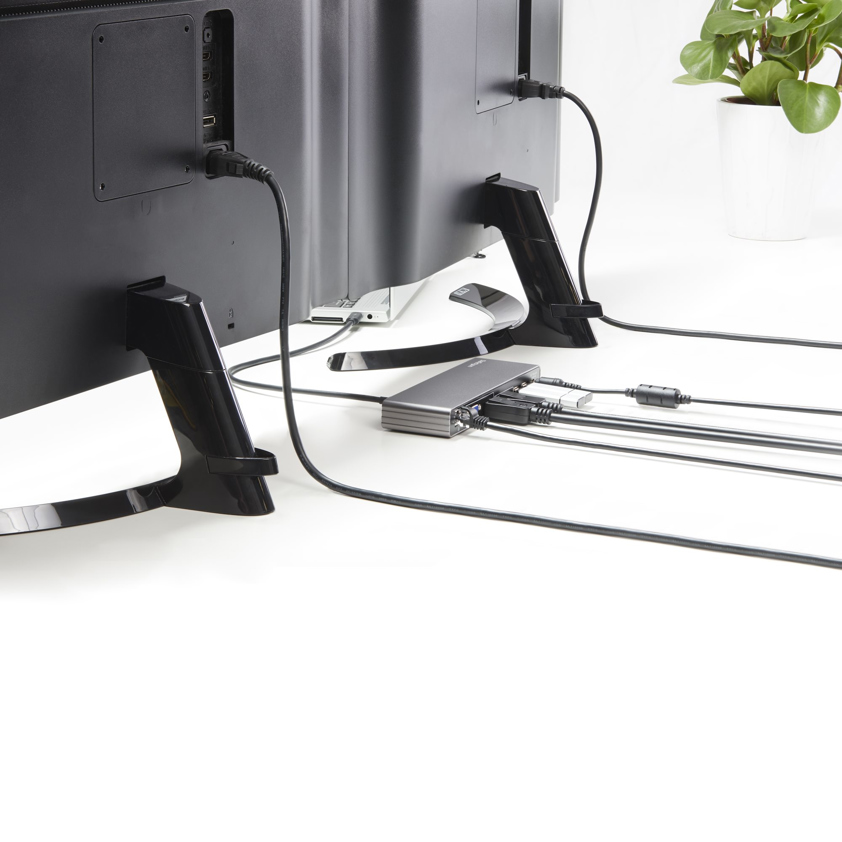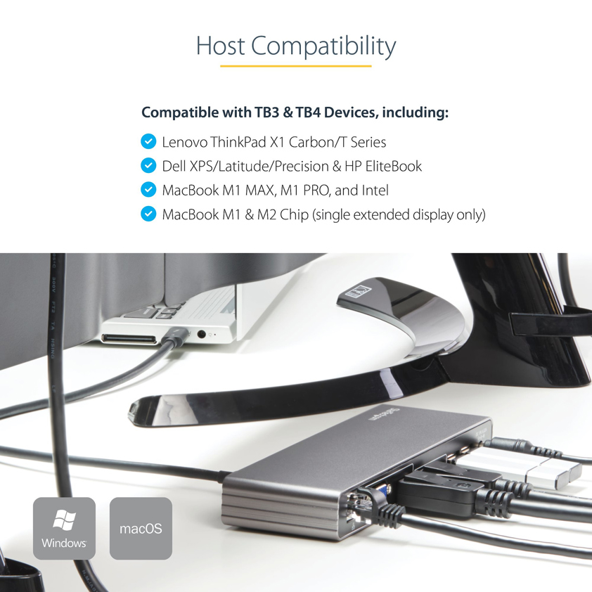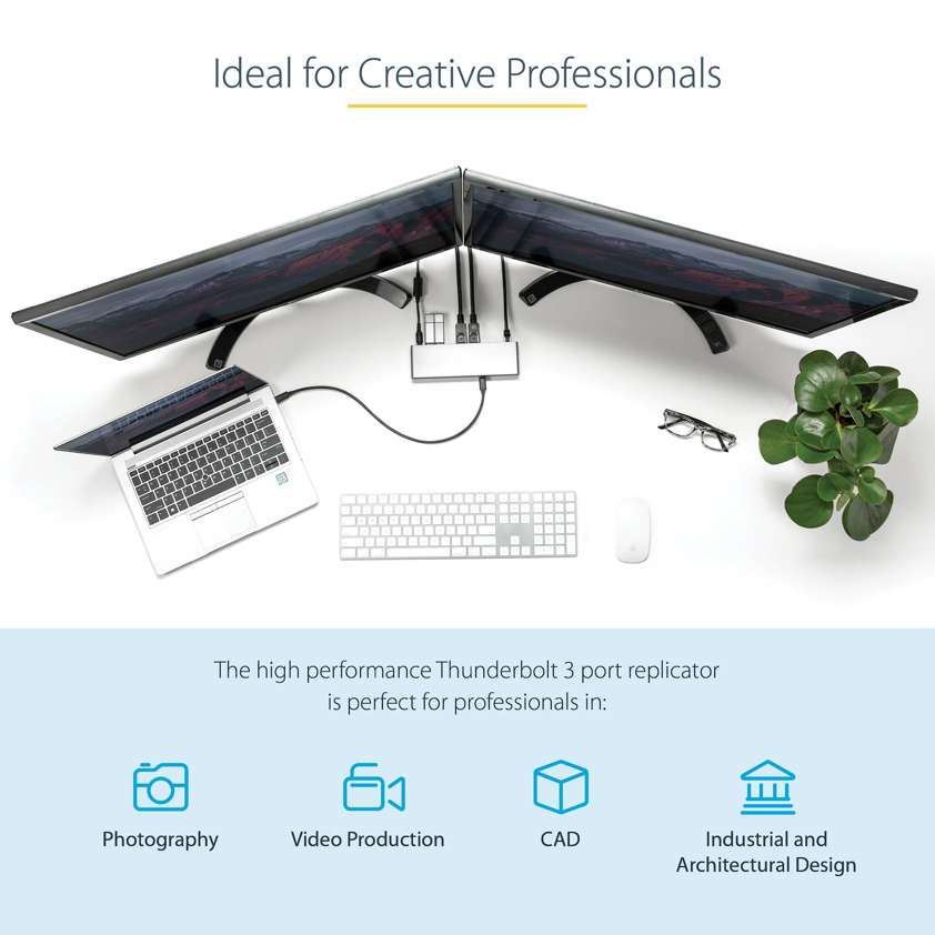 Create a powerful and flexible workstation with this Thunderbolt™ 3 dock. With dedicated dual video output, you can connect your Thunderbolt 3 equipped MacBook Pro or Windows® laptop to two 4K monitors, through a single Thunderbolt 3 cable.