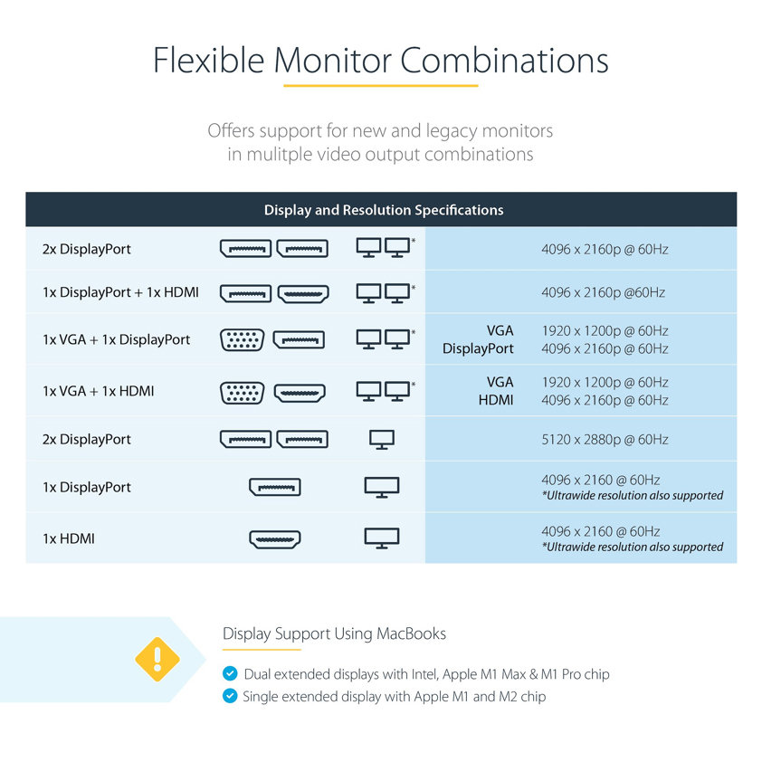 Great for editing 4K video or other Ultra HD tasks, this Thunderbolt 3 docking station supports 40Gbps speeds and 4K resolution at 60Hz on two monitors. Enjoy ultimate flexibility in setting up your workstation, with monitor options including DisplayPort (DP), HDMI and VGA.