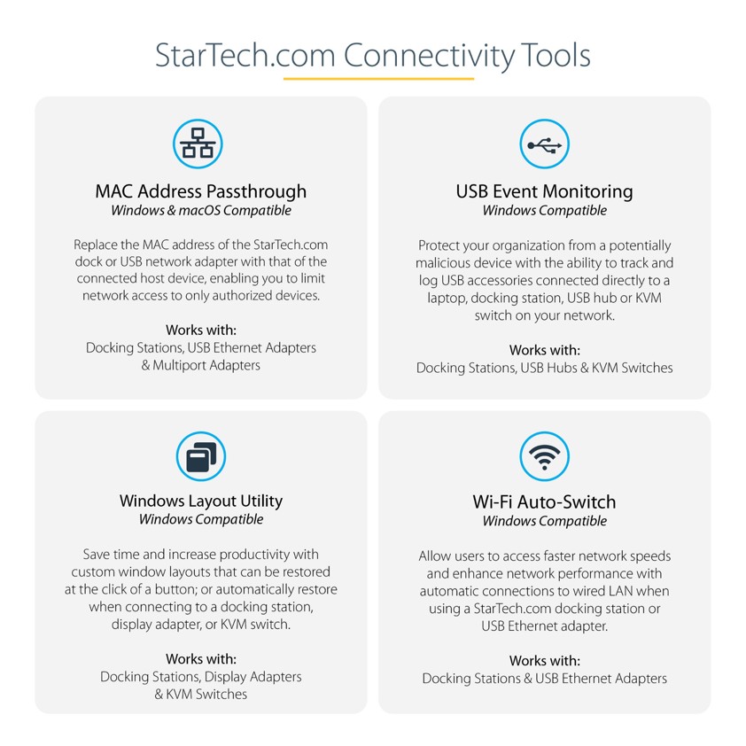 Developed to improve performance and security, StarTech.com Connectivity Tools is the only software suite on the market that works with a wide range of IT connectivity accessories. The software suite includes: