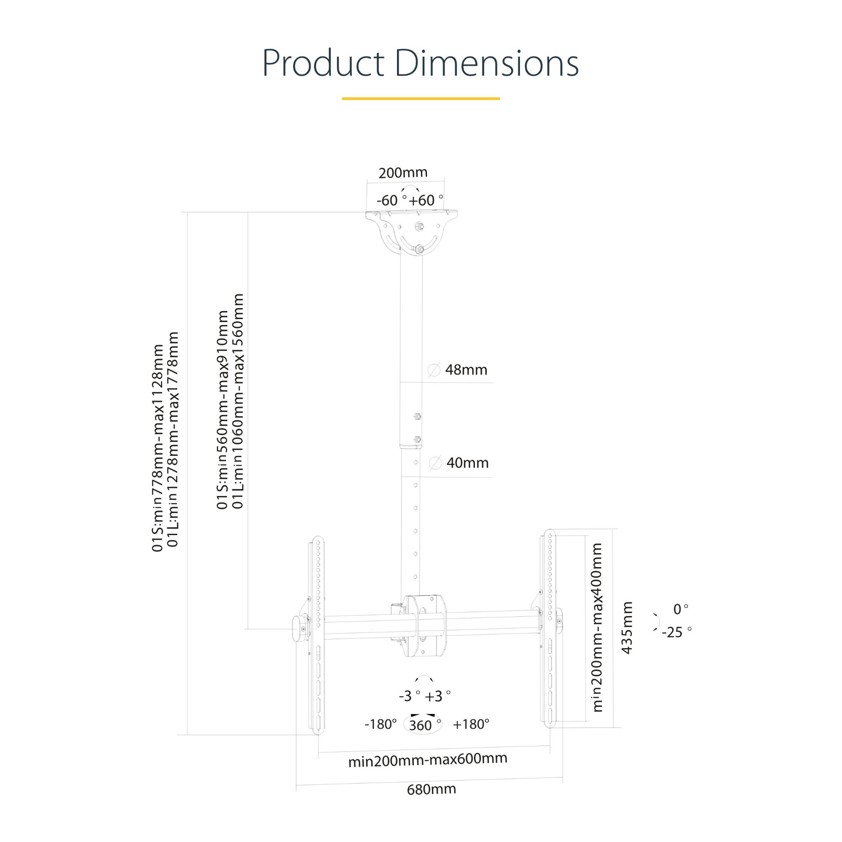 With a telescopic pole, the TV mount lets you suspend a display at your desired distance from the ceiling. This works well with a range of ceiling heights. The steel pole can extend from 42" to 61" (1060 to 1560 mm) , with a total lift (height extension) of 19.7" (500 mm).