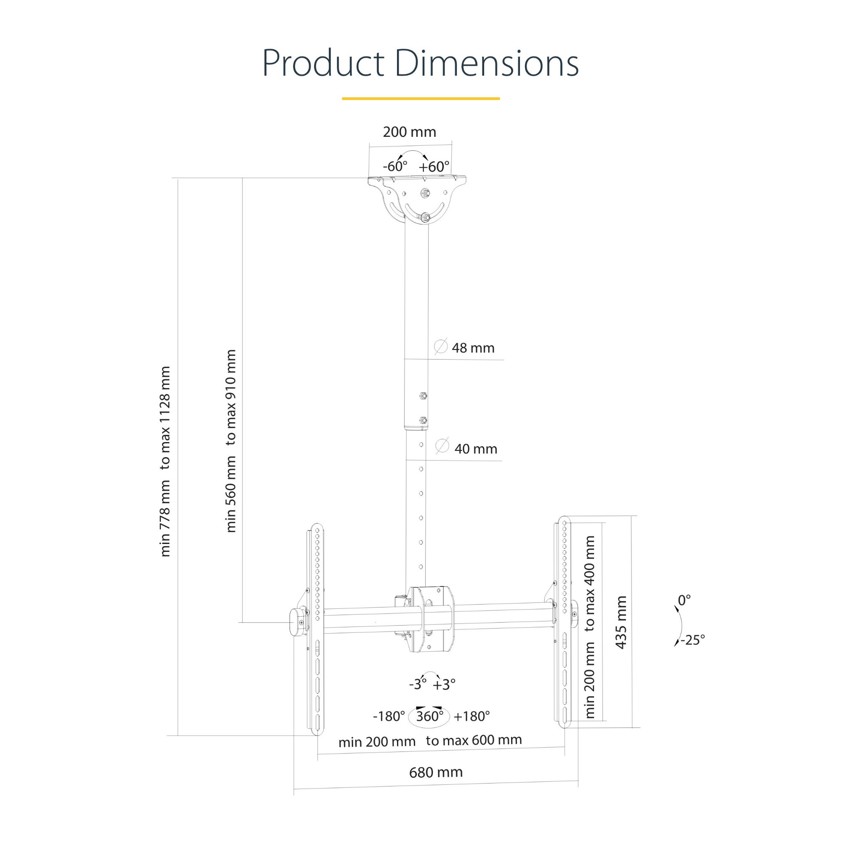 With a telescopic pole, the TV mount lets you suspend a display at your desired distance from the ceiling. This works well with a range of ceiling heights. The steel pole can extend from 22" to 33.5" (560 to 910 mm), with a total lift (height extension) of 13.7" (350 mm).