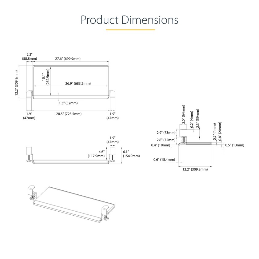 The keyboard tray has rails that enable it to slide in and out from under the desk effortlessly. Once assembled, the desk clamps are installed by hand and support desks with a thickness up to 2.3 in (58.4 mm). The anti-slip pads provide a firm attachment to the desk while protecting the surface of the desk. Adjust the height of the tray to one of the three available settings: 3.9, 4.7, or 5.5 in (100, 120, or 140 mm, respectively). One of the three settings will ensure proper clearance between you and the tray while providing the ideal height for an ergonomic workspace. The desk clamps occupy minimal desk surface space, only 1.8 x 2.5 in (47 x 64 mm) per clamp.