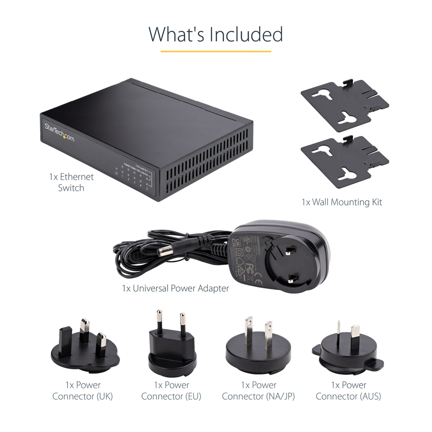 • StarTech.com Unmanaged 2.5G Switch - 5 Port Gigabit Switch - 2.5GBASE-T Unmanaged Ethernet Switch - Ethernet Splitter - Din Rail or Wall Mount - Multi-Gigabit - Auto-MDIX - 9K Jumbo