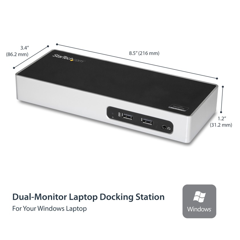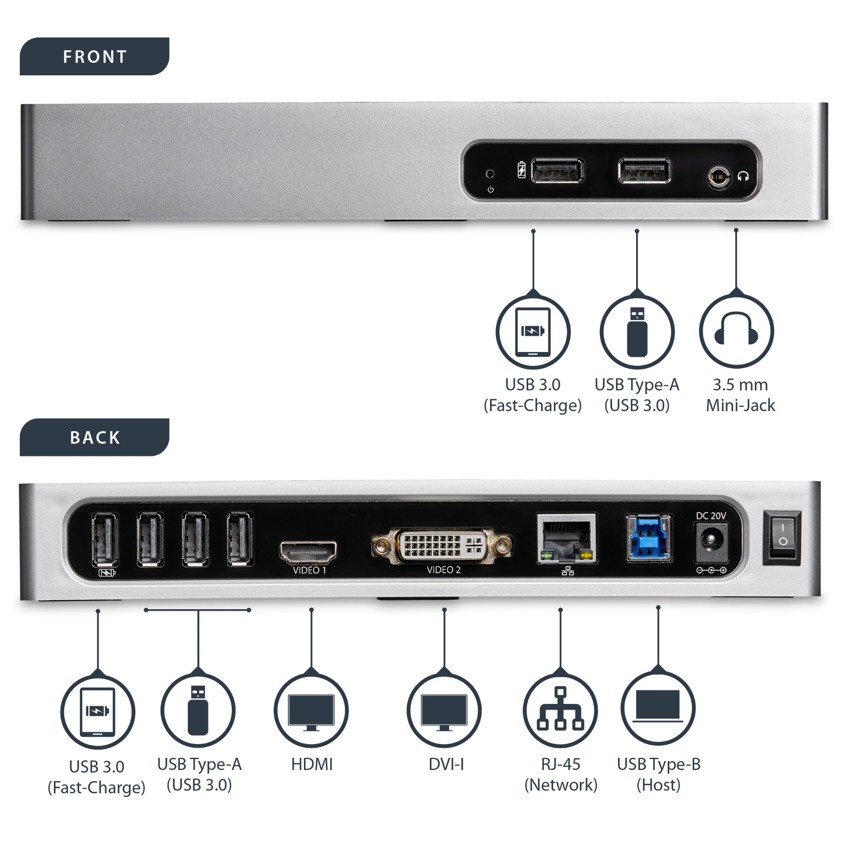 This USB 3.0 docking station for Mac and Windows™ laptops gives you display flexibility and the ports you need to maximize workstation performance. The cost-effective dual-monitor docking station provides many video output options including HDMI®, DVI and VGA (with adapter), and gives you six USB ports for peripherals, including two fast-charge USB ports.