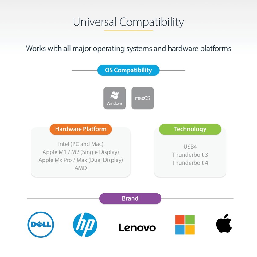This universal Thunderbolt 3 / USB-C Dock has an automatic driver setup and includes a longer 0.8 meter (2.6 ft) Thunderbolt 3 host cable, front-facing TB3/USB-C host port, front-facing LED indicator, mounting holes for the optional bracket, k-slot for security lock & MAC address changer utility.