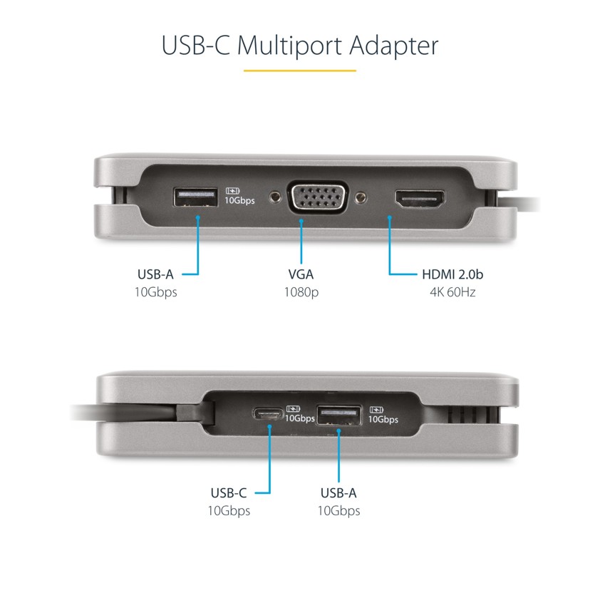 StarTech.com USB-C Multiport Adapter - HDMI/VGA - 4K 60Hz - 3-Port USB Hub - 100W Power Delivery Pass-Through - GbE - Travel Mini Docking Station w/ Charging - 1ft/30cm Wrap-Around Cable