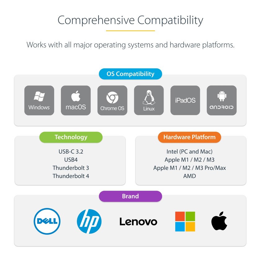 Create a workstation, with a single 4K 60Hz HDMI or 1080p VGA, multiple USB ports, Gigabit Ethernet, and 100W Power Delivery pass-through