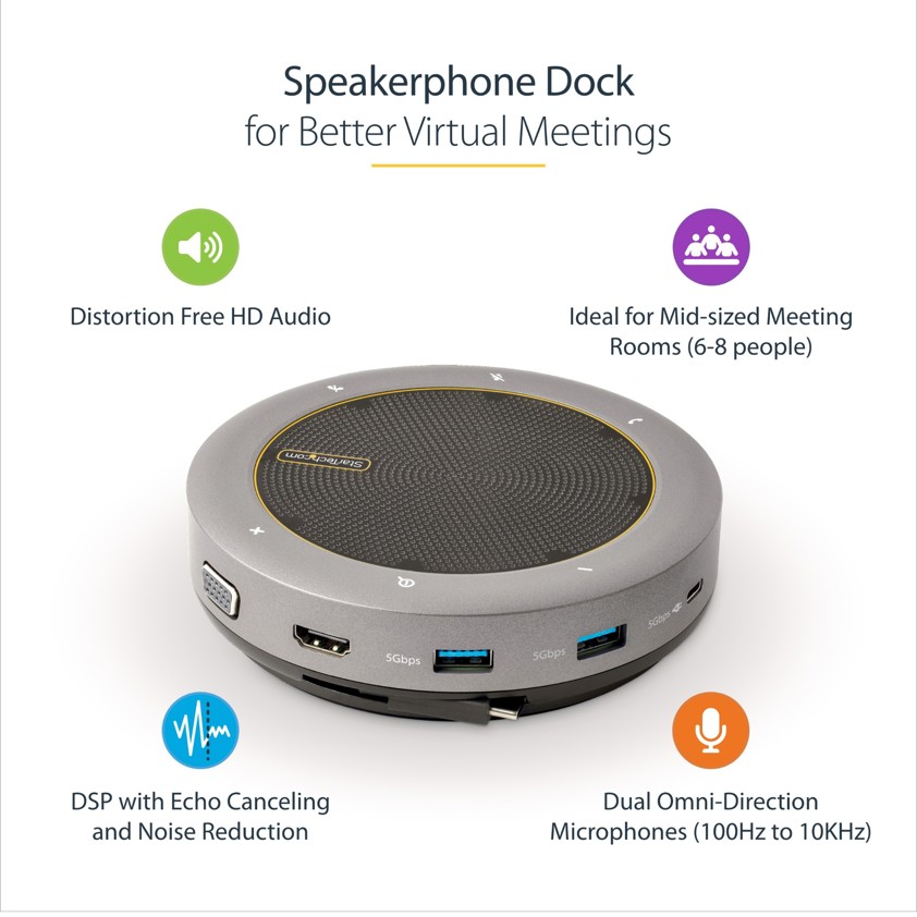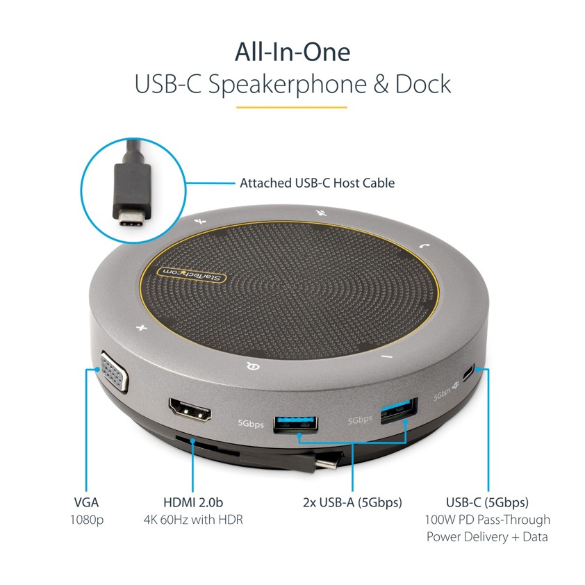 StarTech.com USB-C Speakerphone Docking Station, Mini Portable Conference Speaker and Audio Dock, USB-C to VGA/4K HDMI, 2x USB-A Hub, Mic/Speaker, Teams/Zoom/Softphone Speakerphone