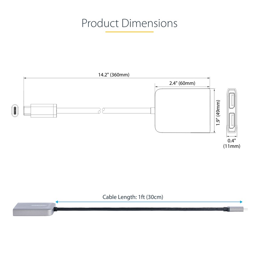 Windows devices supporting DP Alt Mode over USB-C feature native support for MST. This USB-C to DP hub is compatible Thunderbolt 3/4 and USB4-enabled Windows devices with 11th generation (and later) processors. Plug-and-play installation, with no drivers or software required. The 12in (30cm) built-on cable provides options for flexible installation configurations, reducing the amount of strain on ports and connectors. Additionally, this dual-monitor splitter is bus-powered, requiring no external power source.