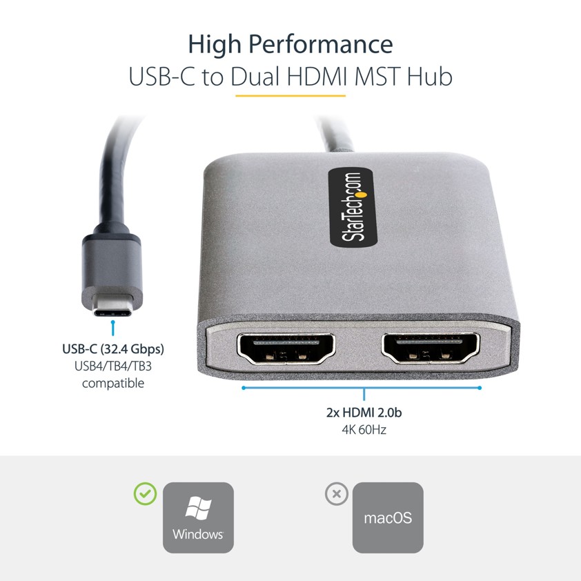StarTech.com USB-C to Dual HDMI MST HUB - Dual HDMI 4K 60Hz - USB Type C Multi Monitor Adapter for Laptop w/ 1ft/30cm cable - DP 1.4 Multi-Stream Transport Hub - USB-C to HDMI Splitter