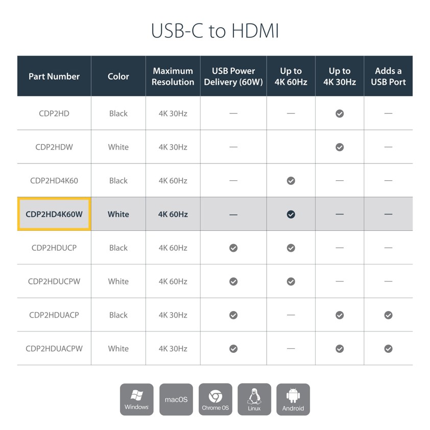 The CDP2HD4K60W is backed by a 3-year StarTech.com warranty and free lifetime technical support.