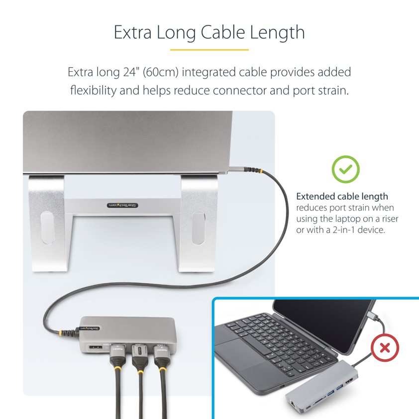 The mini docking station features a built-in 2 ft. (60 cm) USB-C host cable with a high-quality TPE jacket and strain relief, for enhanced durability and longevity. The Multiport Adapter housing features a built-in EMI shield to protect the main board and integrated chips from electromagnetic interference, preventing signal interference between electronic devices and ensuring reliable performance.