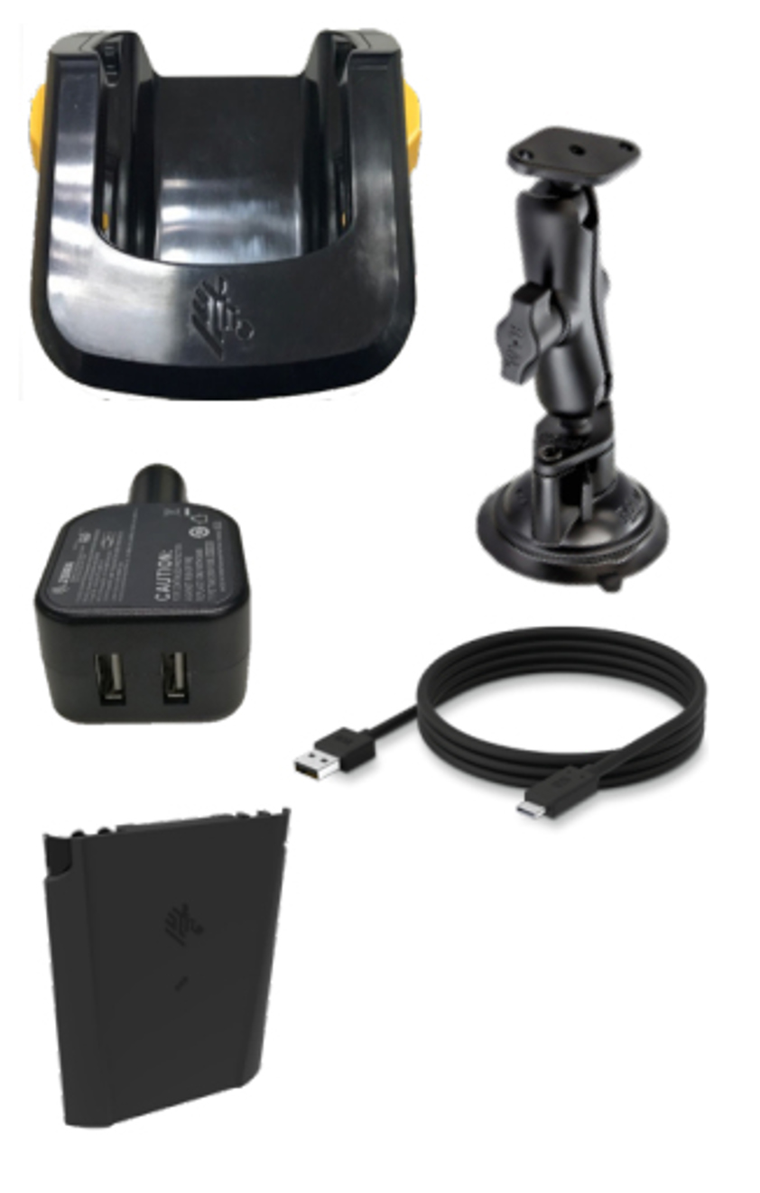 Zebra TC51/TC56 Vehicle accessory kit, includes a charge-only vehicle cradle, RAM suction cup mount, USB charge cable, cigarette lighter adapter, and a PowerPrecision+ spare lithium ion Battery (4150 mAh),